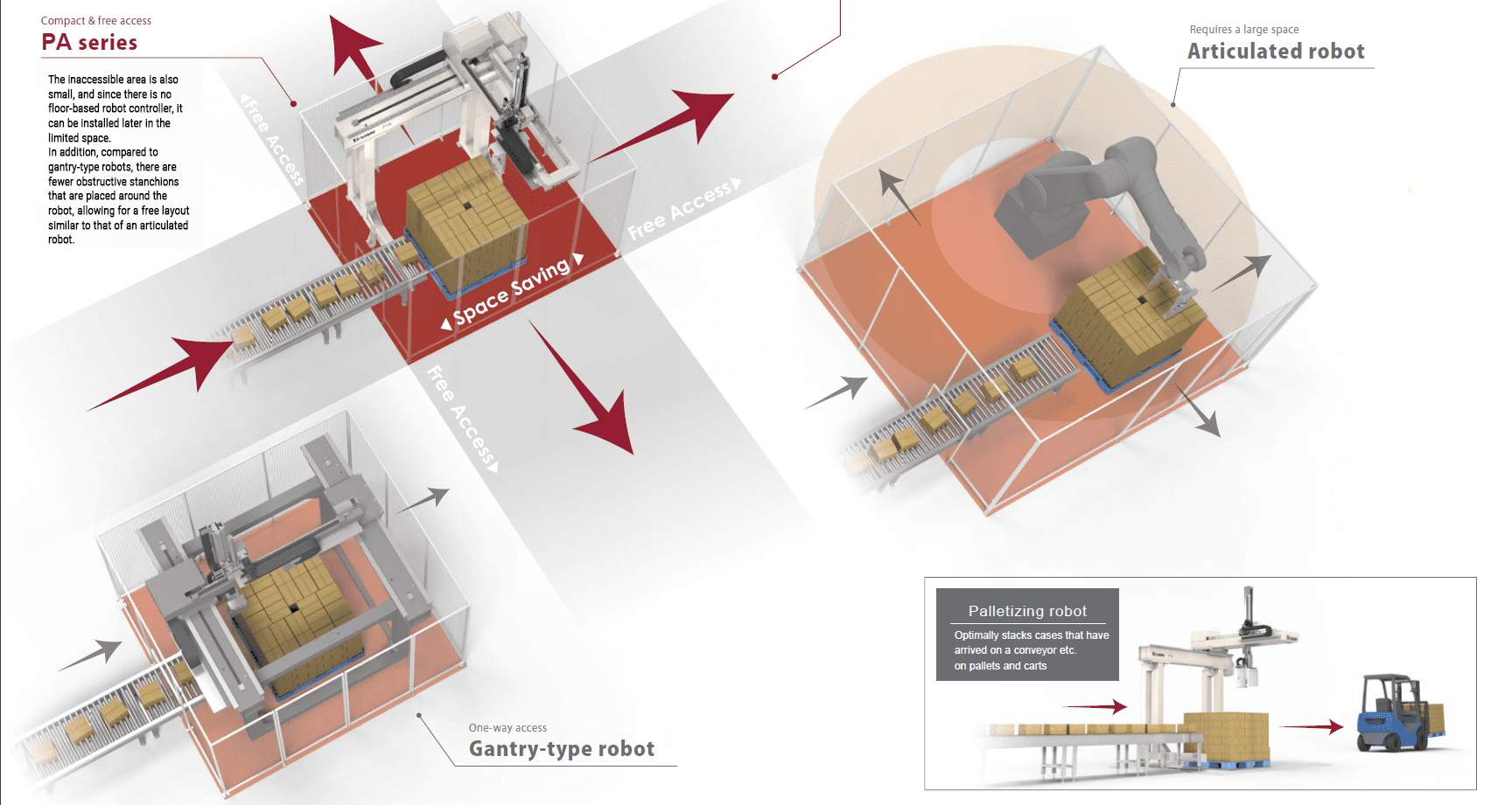 The PA palletizing robot contributes to solving labor shortages in the manufacturing sector by automating various applications in the field: