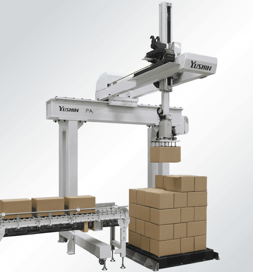 Yushin developed the space-saving palletizing robot “PA” series for plastic injection molding industry. Palletizing robots are available not only in the manufacturing industry but are now a product for the market where rapid automation is required due to labor shortage at distribution sites. The technical capabilities cultivated up to this point will be utilized. This “PA” series is the “PA-20”, which supports a payload of 20 kg, will meet a wide range of customer needs by offering a lineup of two models of the “PA-40” that support the same 40 kg.