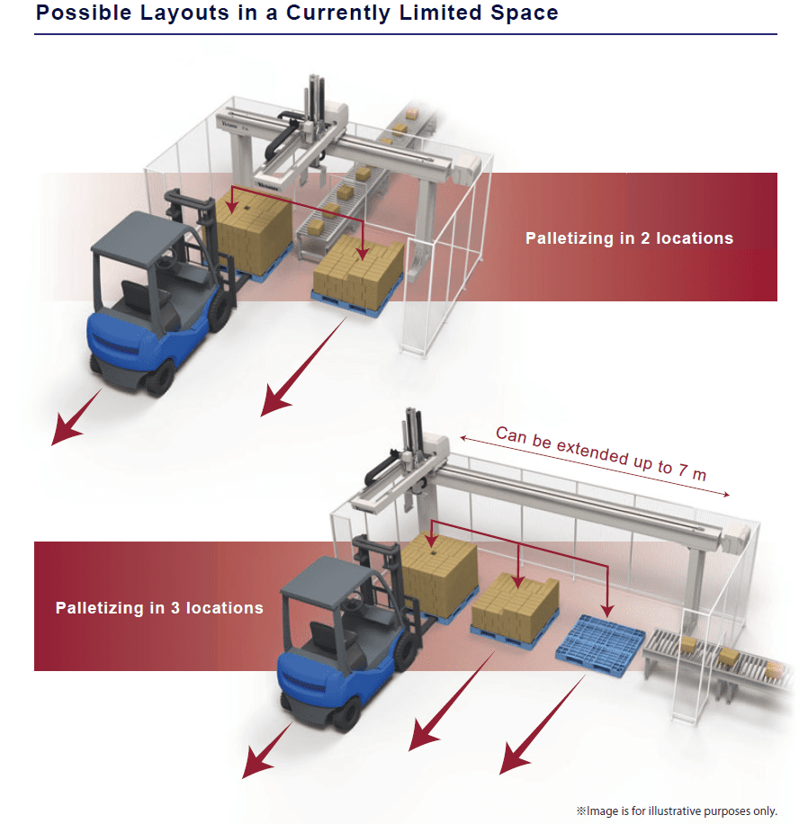 Reduction of installation space that maximizes the advantages of Cartesian robots and placement around the cantilever structure with few columns ensures the freedom of layout. The minimal footprint creates fewer obstacles for conversion, and the limited space can be effectively used.