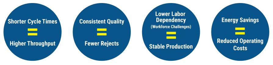 - Ultra-fast cycle times for part removal from Injection Molding Machines